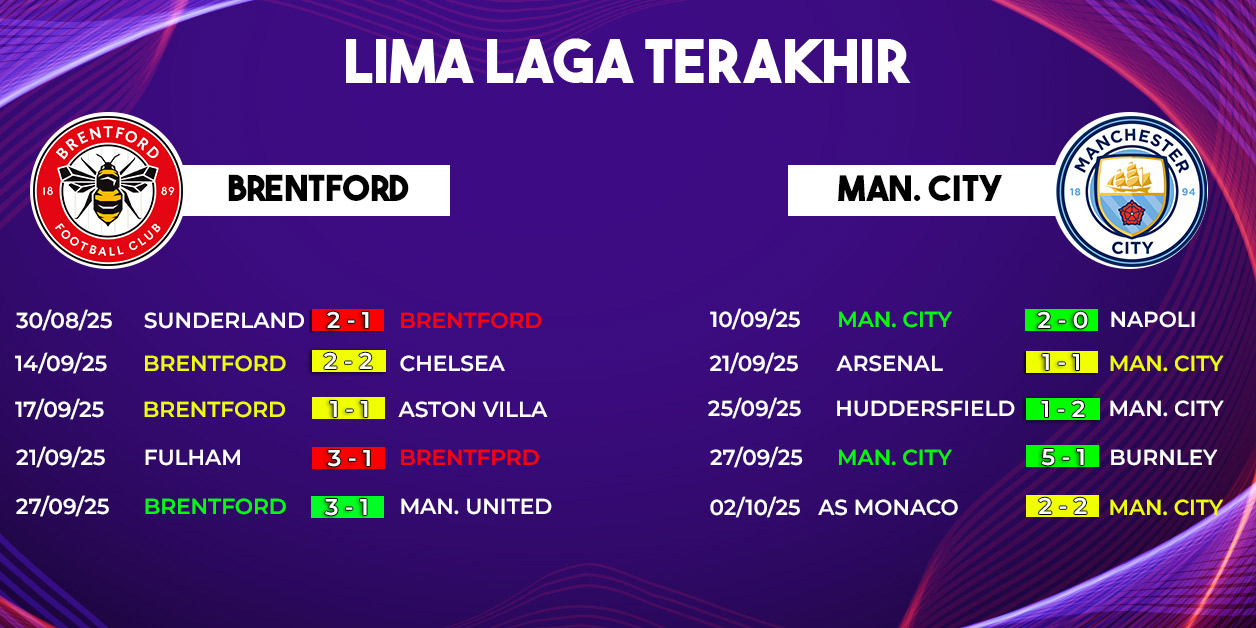 City juga punya catatan pertemuan yang lebih baik atas Brentford. Dalam empat laga terakhir, The Citizens memenangkan tiga pertandingan. Meski begitu, mereka tetap perlu waspada, karena musim lalu Brentford sempat berhasil menahan imbang City setelah bangkit dari ketertinggalan dua gol.