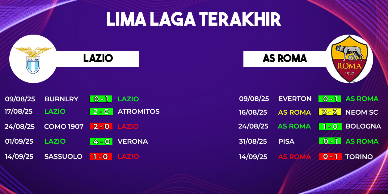 Lazio dan AS Roma akan berjumpa pada pekan ke-4 Serie A 2025/2026. Pertandingan Liga Italia antara Lazio vs AS Roma ini dimainkan di Olimpico. Pertandingannya akan kick-off Minggu, 21 September 2025, jam 17.30 WIB, live streaming di Vidio.