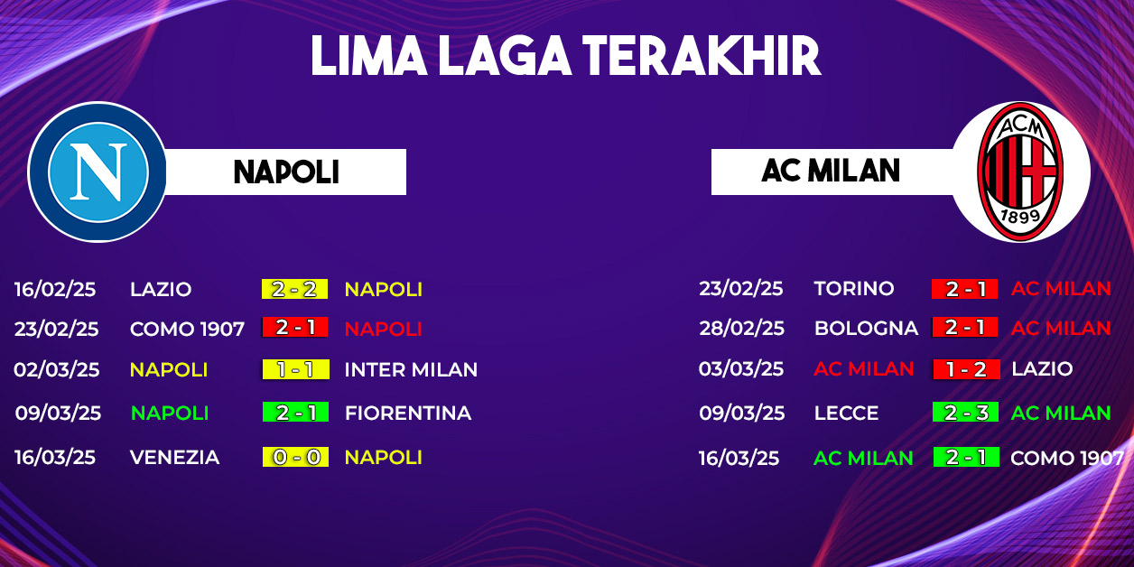 Di sisi lain, AC Milan datang dengan kepercayaan diri usai meraih kemenangan beruntun atas Lecce dan Como. Namun, sebelum itu, mereka sempat mengalami tiga kekalahan berturut-turut dari Torino, Bologna, dan Lazio dengan skor identik 1-2. Inkonsistensi inilah yang menjadi tantangan bagi Sergio Conceicao dalam meracik strategi terbaik untuk menghadapi Napoli.